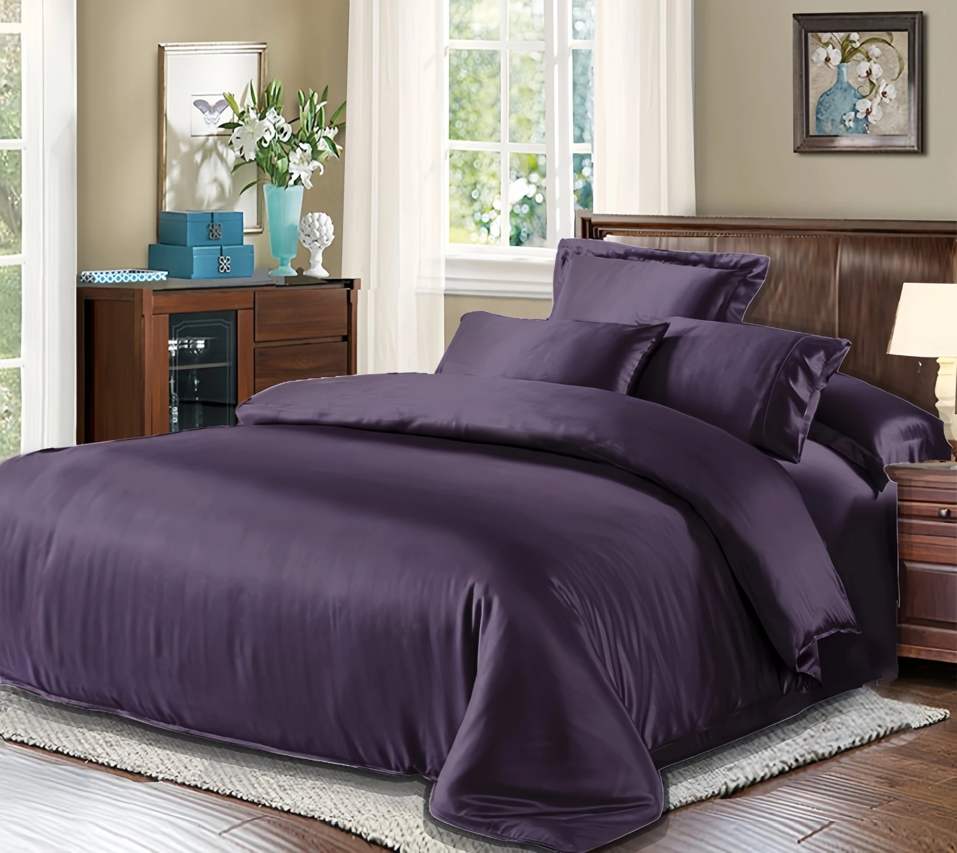 Elevate your sleep with this 100% Mulberry Silk Bed Sheet Set, crafted from 22 Momme premium silk for exceptional softness, durability, and natural luster. The seamless construction delivers a smooth, elegant finish, while the rich dark blue and silvery tones add a sophisticated, hotel-level luxury to any bedroom.